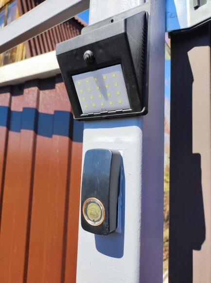 Теперь мы опять довольные с перенастроенными воротами Еще и дополнительно около кинетического звонка установили фонарь на солнечных батареях: