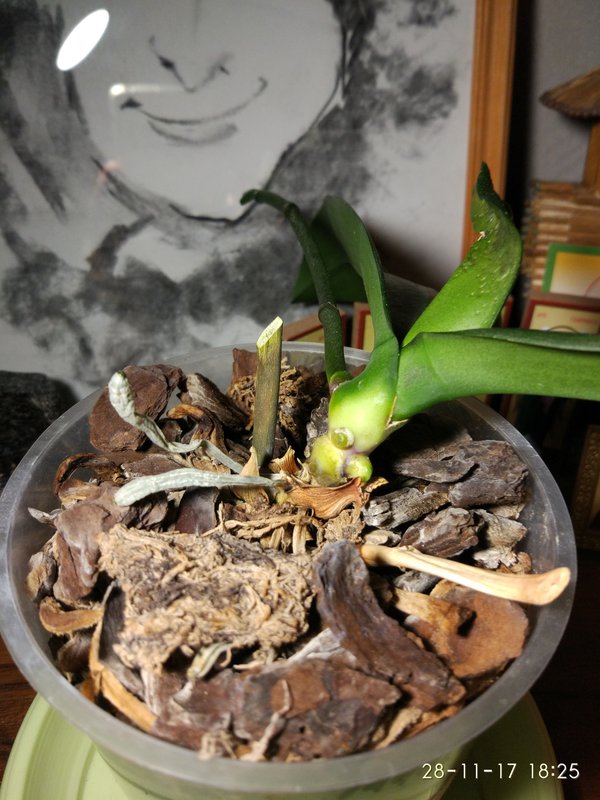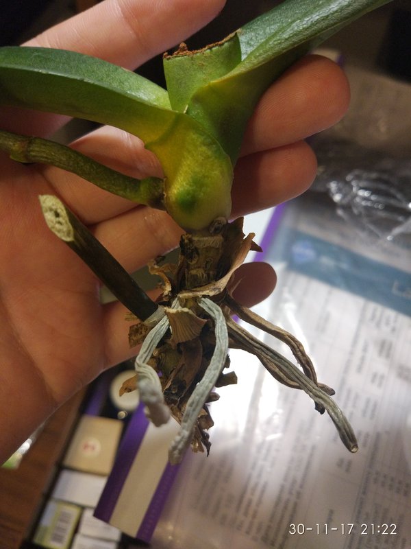 Сегодня утром вытряхнула ее с коры и обрезала корни- не осталось ни одного живого(( обрезала лист пораженный,присыпала корицей.вычитала что чтоб корни были нужно поставить ее над водой в баночку- поставила под лампу.вот как она выглядит сейчас- боюсь что пропадет все таки...