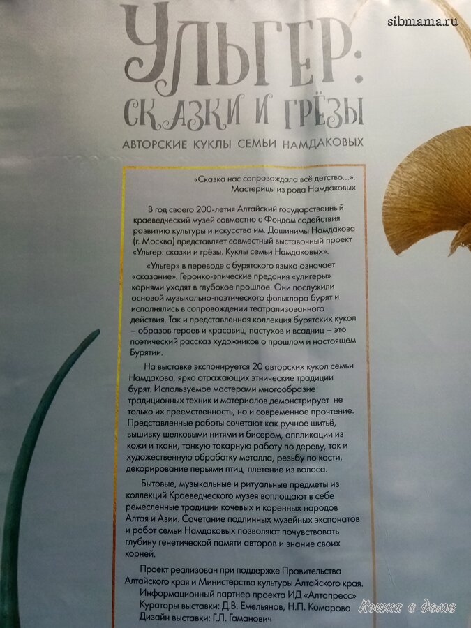 На это раз встречаемся в пространстве выставки авторских кукол семьи Даши Намдакова «Ульгер. Сказки и грезы». Такое соединение – весьма необычный способ совместить посещение музея и театра.