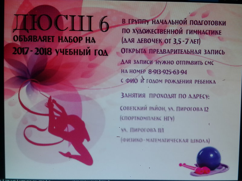 В этой же самой ДСЮШ №6 есть спортивная гимнастика. Занятия проходят в НГУ (старый спорткомплекс). Если ничего за 1,5 года не изменилось. У них оплата тоже есть, только не в месяц, а за каждое занятие. Сколько не скажу.