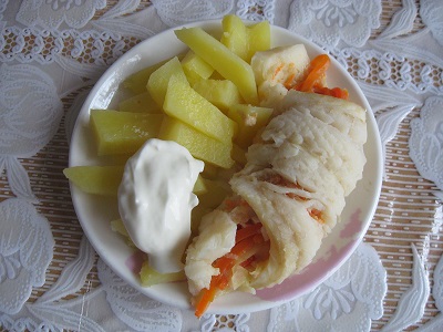 Блюдо родилось практически из ничего, т.е. из того, что осталось от вчерашнего ужина - немного картофельного пюре (около 200г), немного протушенной смеси из фарша с луком и грибами, заблудший кусочек сыра. Еще понадобилось: мука, 1 яйцо и сметана.