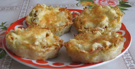 Сегодня в параллель с пиццей делала мужчинам на работу с собой порционный вариант пиццы, это больше похоже на корзиночки с начинкой (идею про картофельные корзиночки украла с той темки, которая появилась и пропала ;) ).
