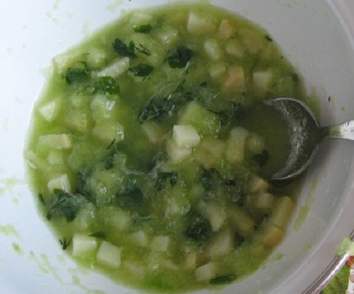 2. Затем натерла его на мелкой терке, добавила соль, 1/2 яйца и хорошо перемешала. (В принципе, можно использовать готовое картофельное пюре).