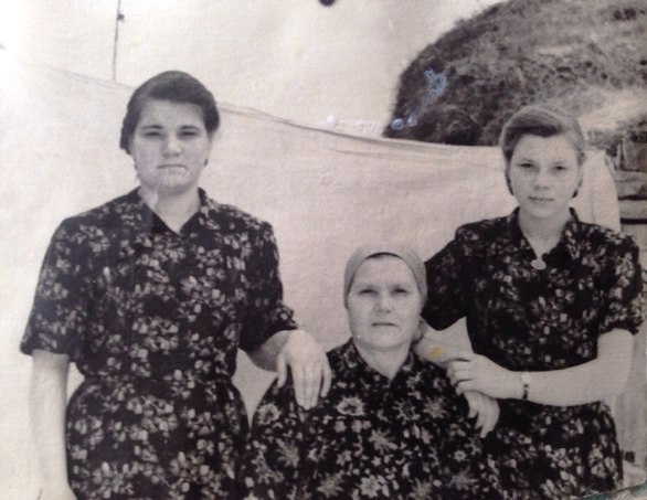 Это фотография примерно 1954-56 года. Прабабушка с дочерьми. Одна их них,крайняя справа, это моя бабушка. Обратите внимание, позади натянута простыня вместо фона. В деревню привезли материю. Сразу купили сколько то и всем пошили одинаковые платья :-) Модницы!