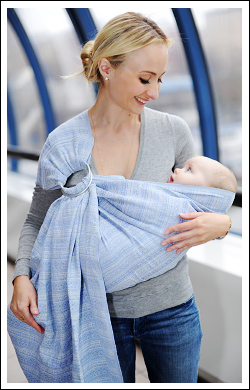 - Полоса ткани приблизительно 70х200 см. Один конец полотна – хвост – оставляют свободным или сшивают особым образом, а в другой вставляют два кольца. Хвост заправляют в кольца и регулируют слинг, вытягивая его края – бортики.