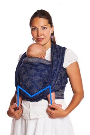 Отставленый таз– таз ребенка расположен дальше от мамы, чем плечики. Если посмотреть в профиль – спина ребенка не строго вертикальна, а находится под небольшим углом, плотно притянутый кармашек ткани у затылка (или под мышками) расширяется книзу. Поза принимается малышом естественно, либо когда мама немного сводит колени ребенка, подталкивая их вверх.