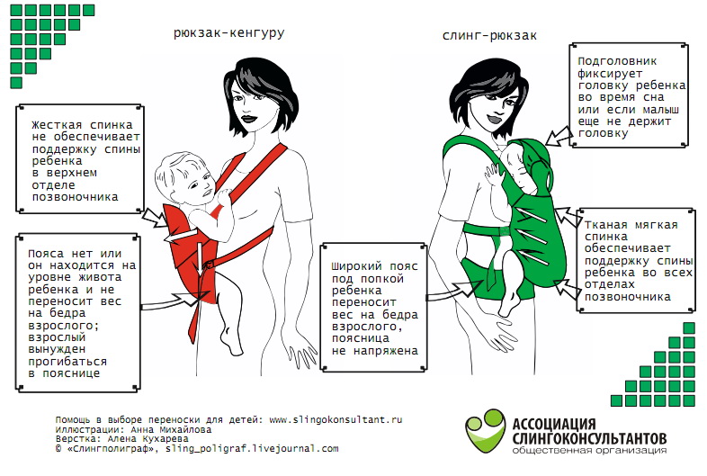 Возможные положения для ребенка: Горизонтальное (с рождения), вертикальное живот к животу с мамой (с рождения), на бедре (с 3-4 месяцев), за спиной (с 3-4 месяцев).