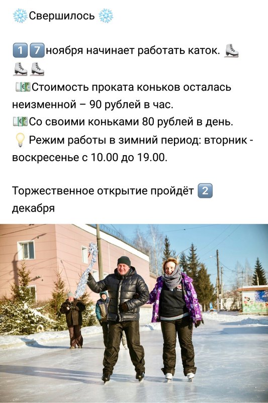В семейно-развлекательном комплексе «Березка» в зимнее время работает каток. На катке имеется хоккейная остекленная коробка, электронное табло, стандартные ворота. В прокате имеется полное хоккейное обмундирование для вратарей и полевых игроков. Каток отлично подойдет для проведения вечеринок, дискотек, детских праздников на льду. Во время массового катания играет фоновая музыка, современная свето-аппаратура: лазерная установка, зеркальный шар.