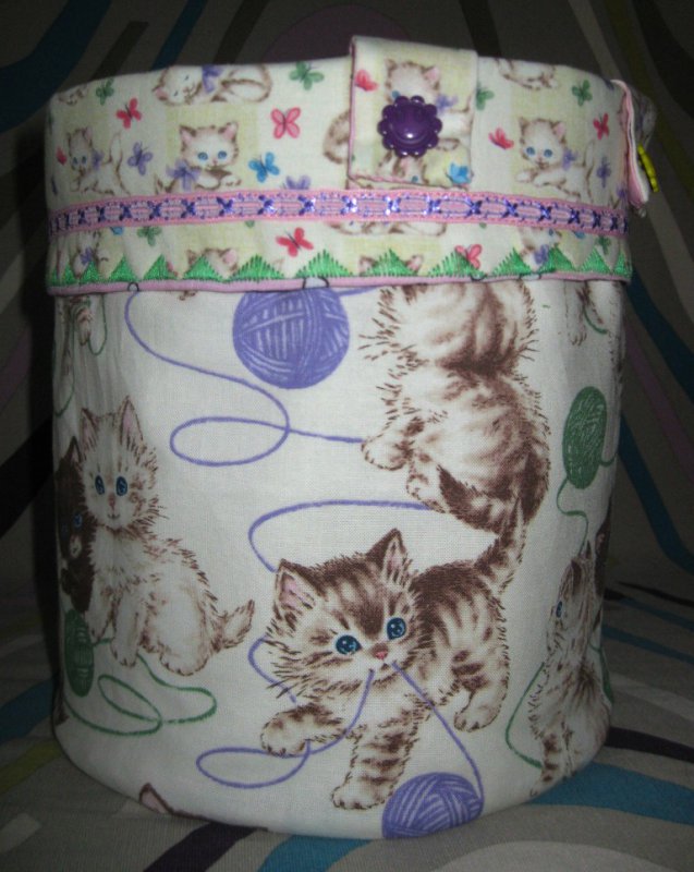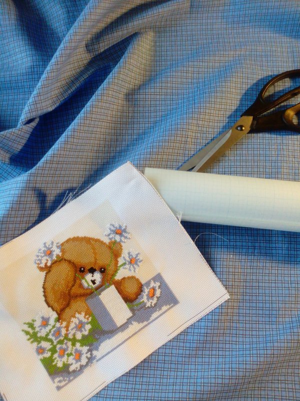 Вот для дачи сшился такой текстильный короб. Пригодилась вышивка с мишкой и кусочек ситца.