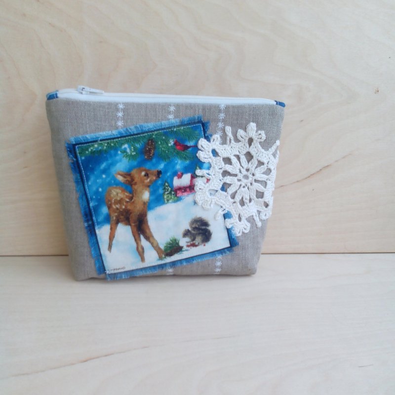 Изначально в качестве декора вязались снежинки. Но рюкзак их не захотел. Смирился с одной на внутркннем кармашке, а две грустили в коробочке. Но недолго. Стали декором для косметичек.