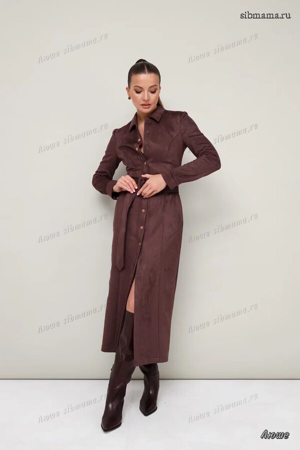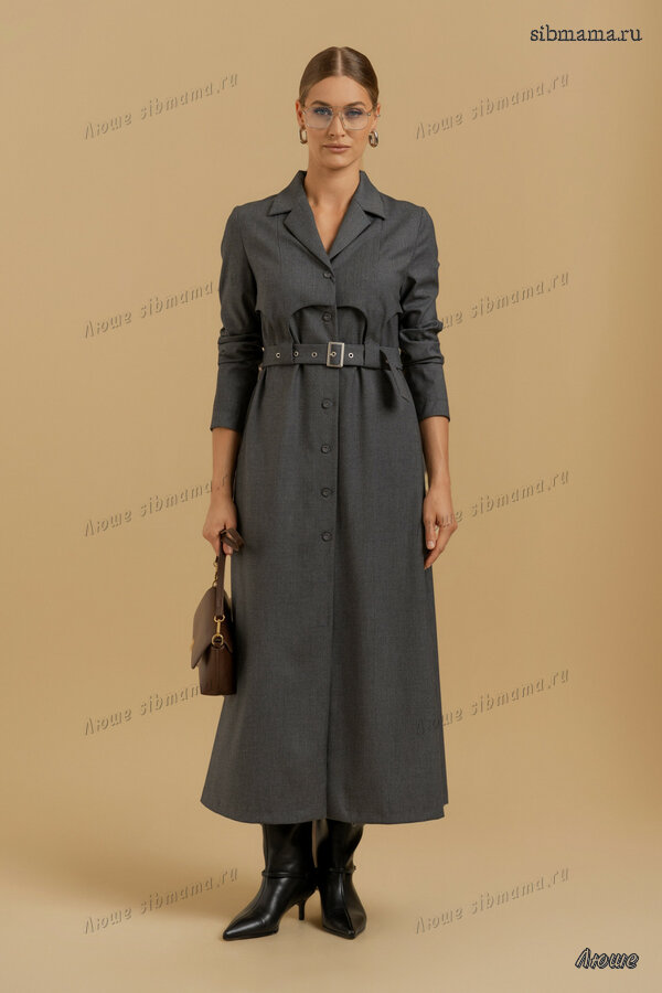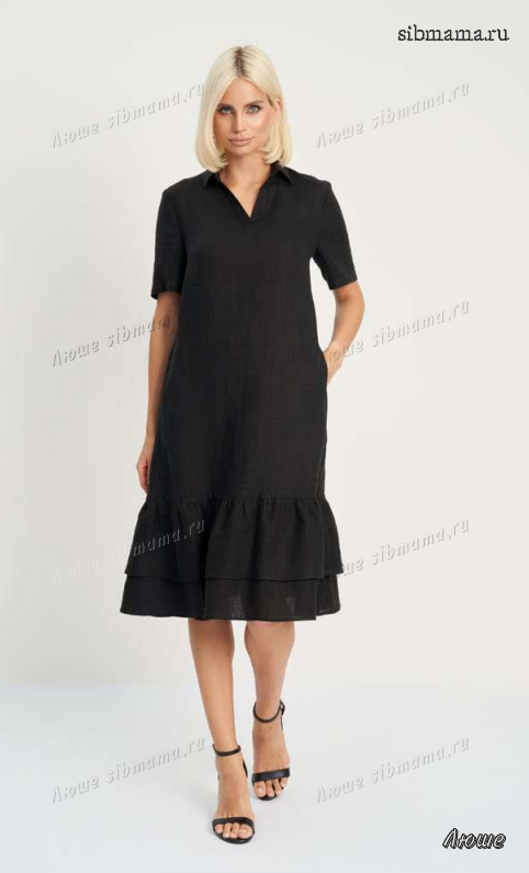 Платье женское, прямого силуэта, длиной ниже линии колен из трикотажной ткани. Перед с нагрудными вытачками. Рукав одношовный, втачной, длинный. Вырез горловины V-образный. Воротник отложной.