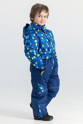 Комбинезон с центральной застежкой на закрытую тесьму молнию с ветрозащитной планкой на липучке. Рукав с напульсником и регулируемым хлястиком на липучке. На нижней части переда прорезные карманы на молнии, нагрудный врезной карман на молнии. Капюшон съемный на молнии с внутренней отделкой флисом и резинкой для фиксации на голове. Воротник отделан флисом. Пояс на пряжке. Снегозащитные манжеты, усиления внизу брючин и молния для удобства одевания обуви. Светоотражающие элементы на коленях. Все швы проклеены и водонепроницаемы.