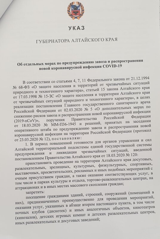Что в ближайшее время вынужденно закроют, что приостановят и куда запретят ходить жителям Алтайского края? Лучше один раз увидеть, а еще лучше прочитать... Губернатор Алтайского края Виктор Томенко сегодня подписал указ «Об отдельных мерах по предупреждению завоза и распространения коронавирусной инфекции COVID-19»