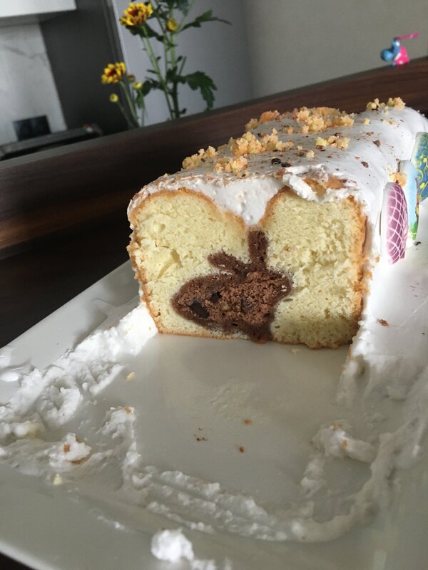 Сначала шоколадный бисквит пекла по самому традиционному рецепту, потом формочкой вырезала зайчиков, «фаршировала» их маленькими шоколадными кусочками, обваливала в сахарно-сметанном креме и вертикально устанавливала один к одному по всей длине формы. А потом заливала белым бисквитным тестом и выпекала.