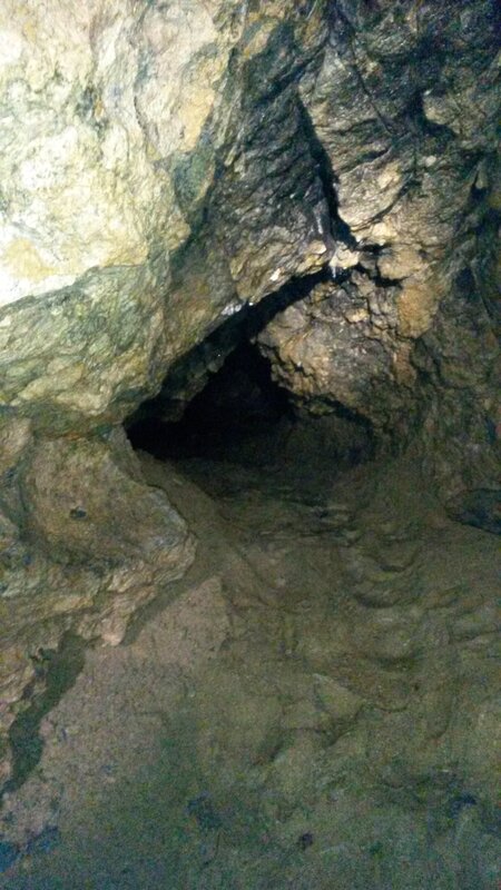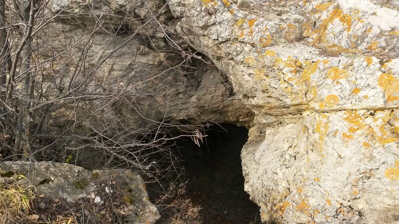 Наконец-то выбрались из леса. И практически сразу увидели скалистые выступы. Значит, мы почти у цели. Подъехали, вон вход виднеется. Пещера небольшая, в открытом доступе метров 5, наверное. А дальше уже для спелеологов, ползком. В пещере тучи комаров, но какие-то тихие, не пищат и не кусаются.