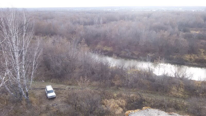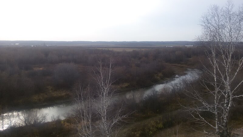 Выбрались на поверхность, залезли наверх, осмотрелись. Вообще-то я ожидала более живописной картины. У дома березы еще все в золотых листьях, а тут уже все облетевшие. Но панорама все равно красивая.
