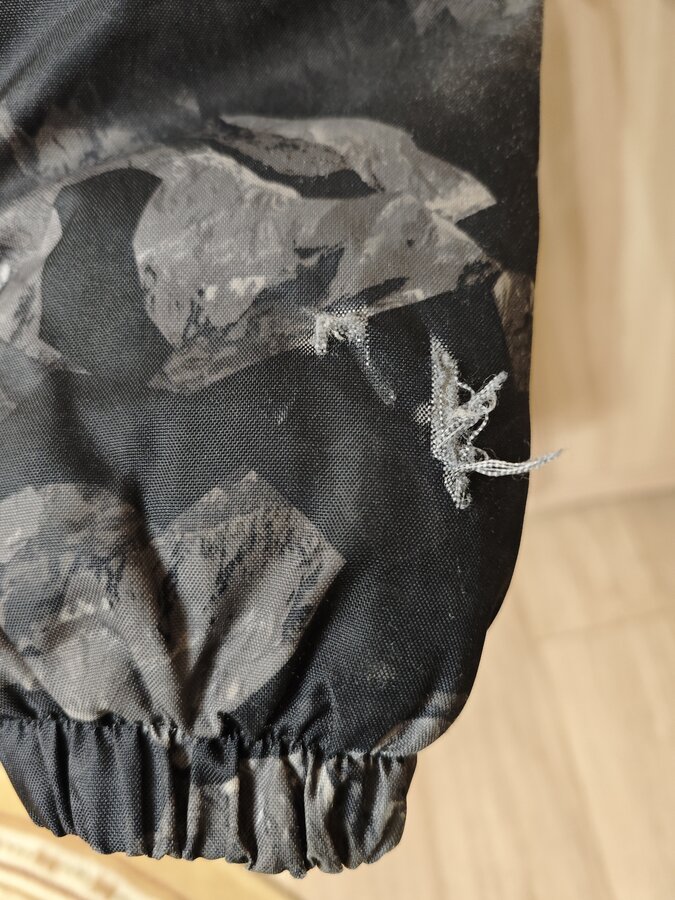 Толстый наполнитель искусственный пух, не маркая , несмотря на светлый цвет. В рукавах манжеты трикотажные. На спине и груди теплый подклад. Мех искусственный. Очень хорошее состояние, заменена подвеска на центральной молнии. На рукаве выше локтя порез верхней ткани 9 мм.
