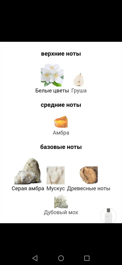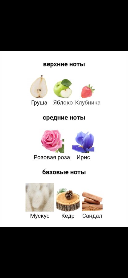 Начальный аккорд парфюма — это искрящийся фейерверк чистых эмоций. Клубника, груша и яблоко сплетаются в аккорд ослепительной сочности, но лишены простоватой сладости. Это взрыв спелой, почти тающей на солнце мякоти, который озаряет сознание, как вспышка беззаботного счастья. Но вот наступает время цветения. Пылкая фруктовость уступает место сердцу композиции — изысканному букету белых цветов. Нежность ириса с его пудрово-кремовой текстурой и утонченная роза в обрамлении зеленых нюансов создают атмосферу умиротворенной элегантности. Это словно прогулка по залитому солнцем цветущему саду, где воздух плотный и густой от аромата. Звучащие в финальном аккорде кедр и сандал дарят композиции стойкий, тёплый и глубокий фундамент. Их суховатая, смолистая древесность, как дорогая кожаная обложка старой книги, придает аромату интеллектуальную глубину и благородную структуру.