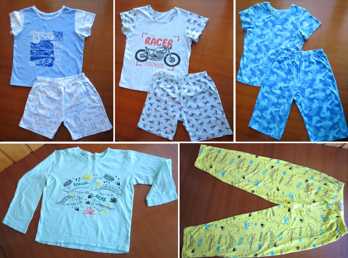 * Пижамы - 4 шт (длинный рукав и длинные штанишки - 1 шт., остальные короткий рукав и шорты. Если ребенок не спит в пижаме, можно носить как шортики и футболки).