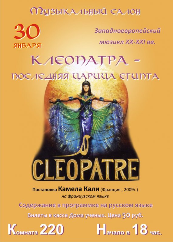 Музыкальный салон и интерклубы Дома ученых приглашают любителей музыкального театра на цикл программ, посвященных жанру мюзикла. Первые 2 встречи состоятся в 2009 г. и посвящаются английскому композитору Эндрю Ллойду Уэбберу, программы января – апреля 2010 г. – французским и венским мюзиклам.