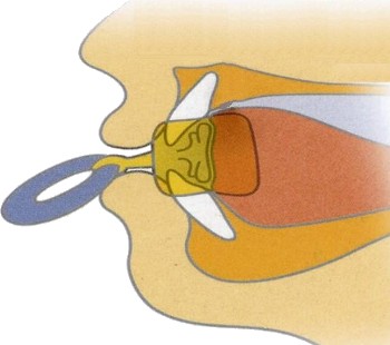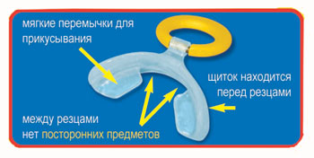 Пластинку с заслонкой для языка мы можем использовать при неправильном типе глотания и прокладывании языка между зубами, создавая ему преграду