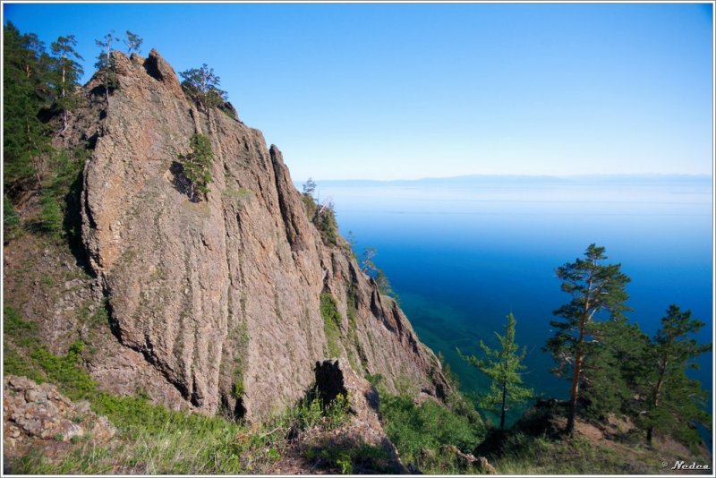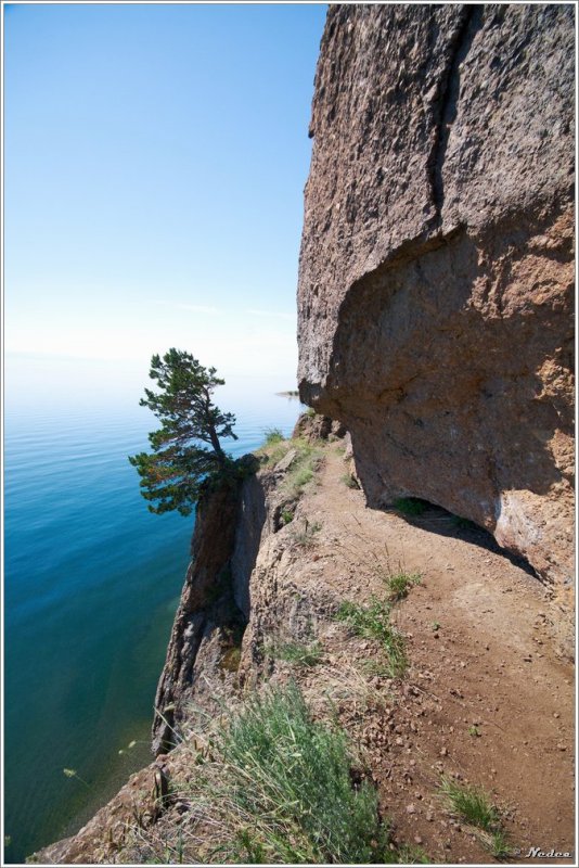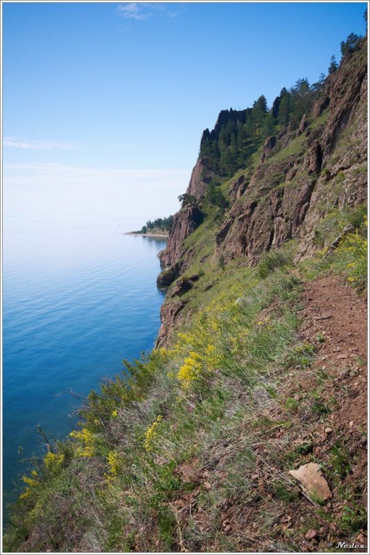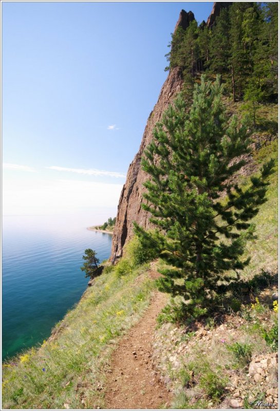 На следующий день продолжили путь. Почти сразу после выхода увидели вновь высоченную скалу. Лениво было на нее лезть, шли и надеялись увидеть какой-нибудь путь у воды... Тропа чуть поднялась, но оборвалась свежим обвалом (в 2010 г). После обвала тропа как ни в чем не бывало шла весело дальше. Но мы то не птички... Пошли назад, искать путь по берегу. Видно было, что по берегу далеко не уйдем - скала уходит в Байкал. Но вскоре, к радости, разглядели путь по скале выше воды на несколько метров. На фото ее немного видно - зеленая полочка с тропинкой.