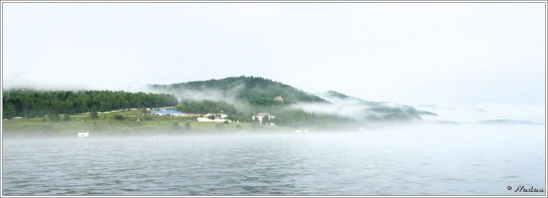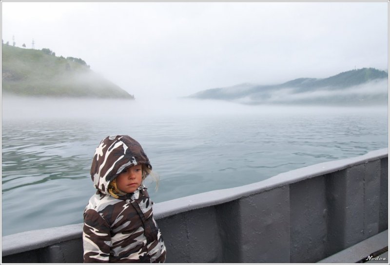 До этого было прохоладно, но солнечно. А пока мчались на Комете, то погода совершенно испортилась – пошел дождь, стало очень холодно. Наш друг из Новосибирска прислал сообщение, что ночью будет +5 и желание ночевать в палатке окончательно прошло. Решили переждать пакость в каком-нибудь домике в Листвянке. Для начала нужно было добраться от порта Байкал (куда нас привезла "Комета") до Листвянки на пароме. Ух, как было холодно и мокро! Нас накрыло то ли облаками, то ли туманом, то ли всем вместе. На втором кадре - Листвянка.