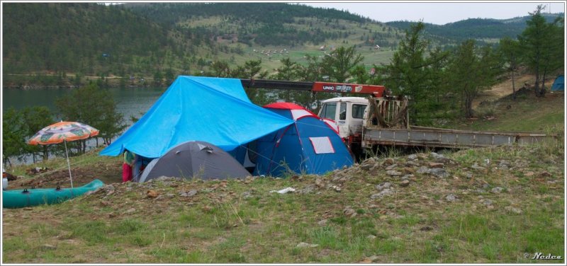 В телеобъектив в помощью приличного приближения сфотографировали наш лагерь. Вон он - самый правый, где машина и две синие палатки. Наша третья палатка умело замаскировалась под горку.