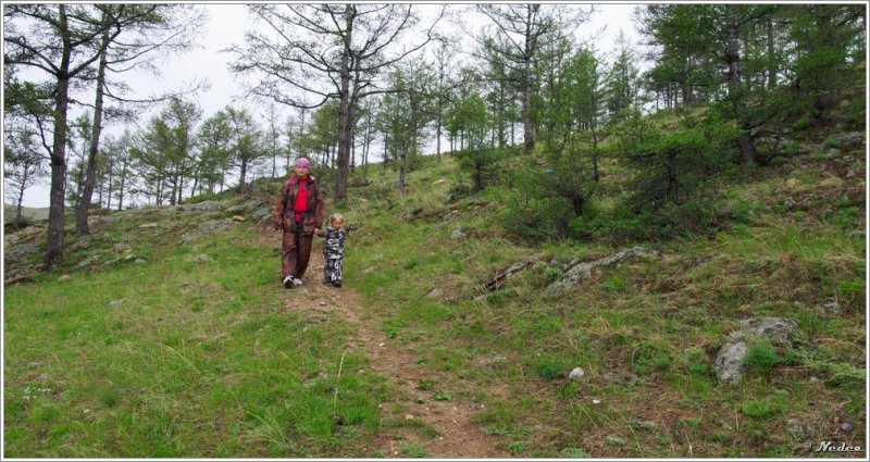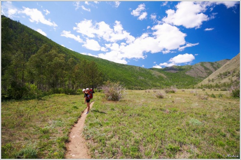 ...Встали утром, с трудом собрались и выдвинулись в пешую часть путешествия по Большой Байкальской Тропе. Ребенок сразу пожелала ехать в своем рюкзаке. А нам сразу предстоял длительный подъем в гору. Я выдохнулась как-то быстро и почувствовала себя тряпкой Не люблю затяжные подъемы. По пути собирали ягодки, грибочки. Было бы куда еще их складывать. Ягоды складывали в животики, грибы донесли до стоянки и сделали грибную похлебку.