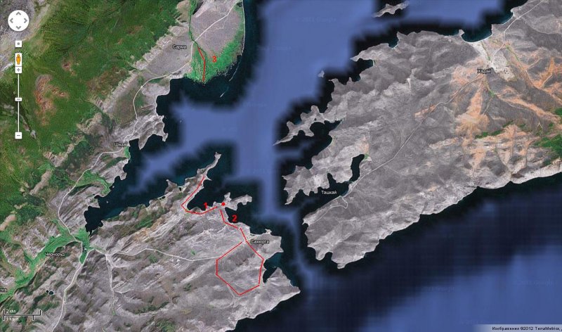На следующий день пошли гулять по окрестностям - на противоположный берег заливчика. Обозначила схематично на снимке со спутника наш путь, обозначила цифрой 1. Кружочек - место нашей стоянки на Малом Море