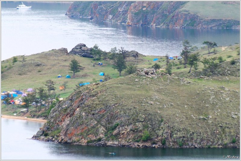 Дальше была бухточка (точнее падь Большая Сенная) – там расположен стационарный лагерь. К берегу причалило несколько маленьких теплоходов с небольшими группами пляжных отдыхающих. Место хорошее, защищено от ветра.