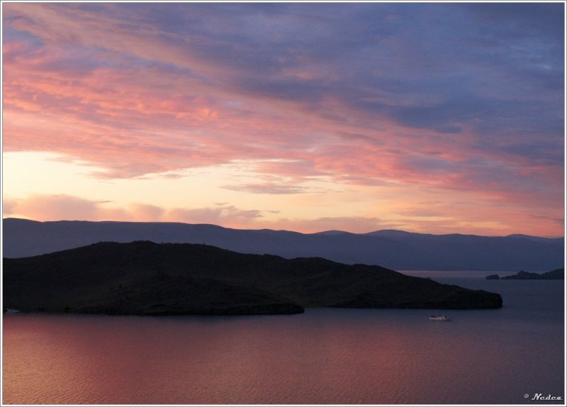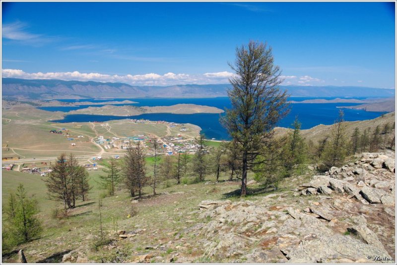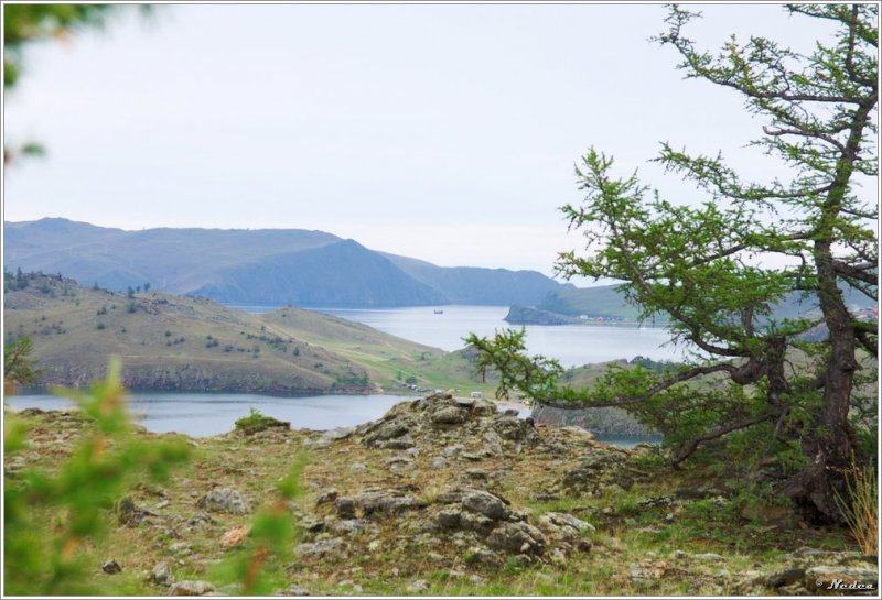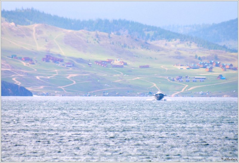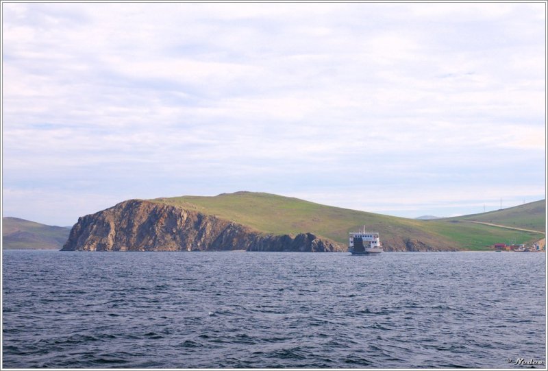 Вдалеке, если присмотреться в телеобъектив, можно увидеть паром, курсирующий между поселком Сахюрта и островом Ольхон. Через несколько дней и мы на нем будем.