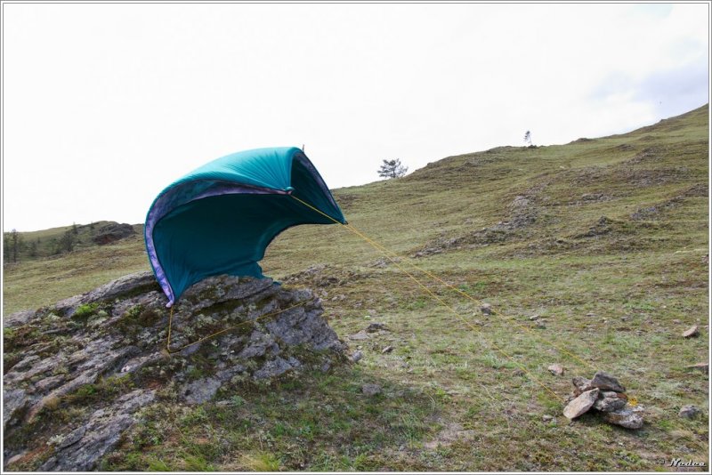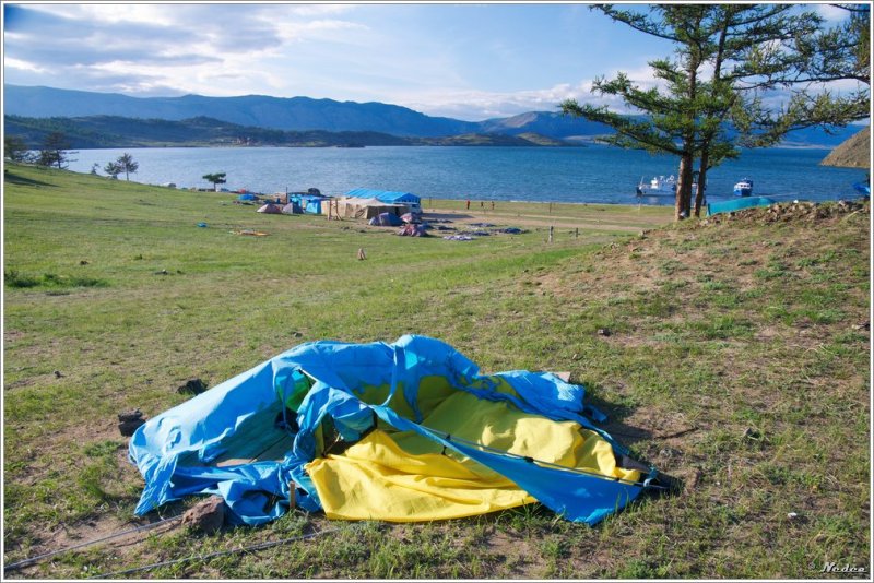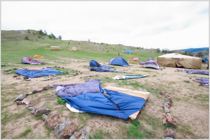 В общем, к чему это я... Потом, через несколько дней, возникла фраза "Если вы не идете к Сарме - сарма придет к вам". Однажды ночью подул сильнейший ветер. Это сопровождалось гулом, казалось, что кто-то живой издает этот звук, жутковато. У наших иркутских друзей палатка была высокая, в рост человека, большая, мы в ней столовую устроили. Хозяева палатку тут же ночью сложили на землю, придавили ящиками и камнями (они местные, сразу сообразили, что к чему). Наши две палатки были более устойчивы перед ветром, специальные для горных походов, выдержали. В детском лагере, расположенном в нашей бухте, картина утром была такая: