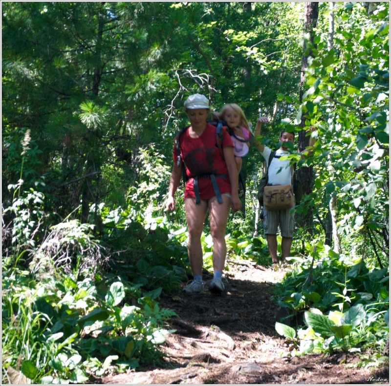 Пеший поход с ребенком планировали давно, собственно с рождения ребенка До этого получались только велосипедные и автомобильные "походы", с небольшими дневными вылазками, с ночевками в палатках рядом с машинами. И вот наконец-то удалось собрать друзей и рюкзаки для небольшого похода. Ребенка весь маршрут несла в спец. рюкзаке, идти ей не хотелось. Наш папа нес вещи за троих, а еду несли друзья…
