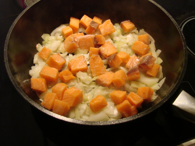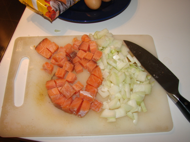 1. Режем лук средними кубиками и рыбу крупными (немного замороженную, так удобней), отправляем на сковородку с разогретым растительным маслом, жарим с закрытой крышкой почти до готовности (5-6 минут)