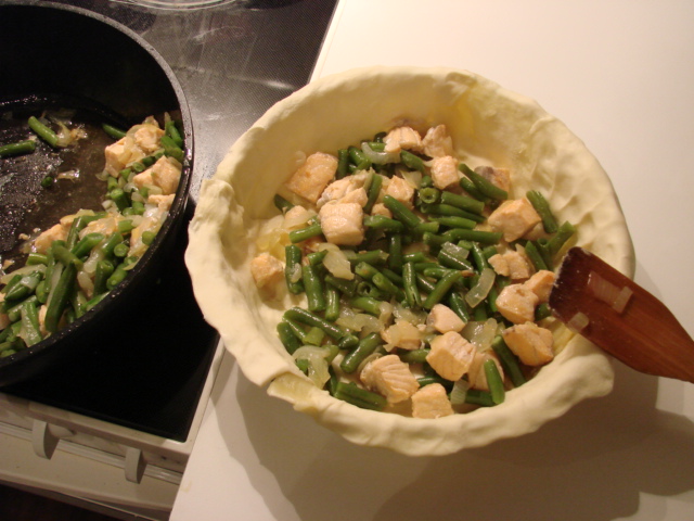 4. Смешиваем фаслось и рыбу с луком, выкладываем в форму для выпекания с тестом.