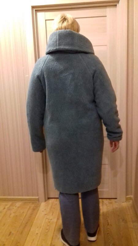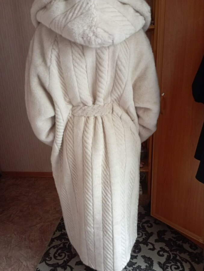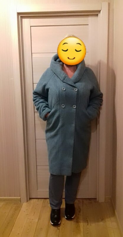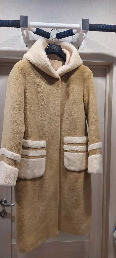 Катя, выставите в пристрой овчинку. Мне по спине тесновата. 46 размер, длина на рост 170 по колено. Прямого силуэта, не как на фото расклешенная. Очень хорошая форма цвет голубой