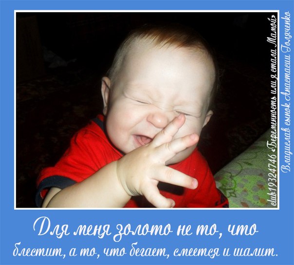 2. "Моим мальчишкам сейчас полтора годика. Один выглядит несколько крупнее другого. Меня часто спрашивают: (а) "Они у вас близнецы?" И когда я отвечаю, что да, они всегда говорят: (б) "Слушайте, а вот этот ГОРАЗДО БОЛЬШЕ своего брата!" Обычно я с некоторым сарказмом отвечаю: "Им положено быть такими. Я об этом читала в близнецовой книге". Как правило, люди уходят озадаченными "Что за близнецовая книга такая?"…"
