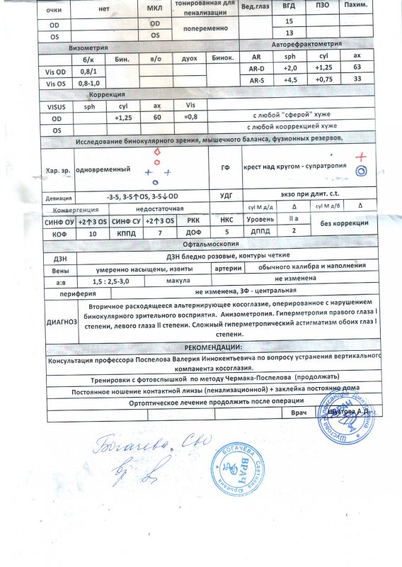 В кратце моя история - мне 35 лет, проживание - г. Екатеринбург, с детства сходящееся косоглазие. родители это проблемой не занимались, соответственно лечение в детстве не проводилось. в 18 лет была проведена операция по поводу косоглазия в местом Микрохирургии глаза (рецессия внутренней мышцы), через два года еще одна операция (тоже рецессия внутренней мышцы но на другом глазу). После этого глаза все равно прямо не встали и я поехала заниматься решением данной проблемы в Москву. В одной из Московских клиник мне диагностировали очень большую дальнозоркость (+6) и назначили очки для ее коррекции, в очках глаза стали буквально разъежаться, то есть из сходящего косоглазие перешло в расходящееся, в той клинике мне предложили снять дальнозоркость лазерной операцией, а потом уже думать что делать с косоглазием. После операции у меня обнаружили способности к бинокулярному зрению и назначили курс упражнений по его развитию, но эти тренировки привели только к мучительному двоению, так как после снятия дальнозоркости появился большой угол расходящегося косоглазия. Затем я обратилась в институт Гельцмогена, там мне тоже особо не помогли. Год назад узнала о профессоре Поспелове и начала лечиться по его методике. Он порекомендовал ношение пенализационной линзы, занятие с фотовспышкой, занятие на синоптофоре, и операцию по воду горизонтального и вертикального косоглазия. В Нижнем Новгороде в Вмизусе-1 (который так сильно рекламирует Поспелов) мне провели репозицию внутренней мышцы по поводу горизонтального косоглазия в октябре 2013 года, но по поводу операции моей вертикали мне отказали (так как слишком маленький угол), Насчет двоения - идет стойкое раздвоение мелких предметов по вертикали, опять же на синоптофоре у меня неплохие результаты по слиянию, но опять же всегда на синоптофоре присутствует угол по вертикали. Мой лечащий врач в Екатеринбурге (которая тоже работает по методике Поспелова) говорит, что мозг у меня готов для бинокулярного зрения, но ему очень трудно подавить имеющуюся вертикаль, Поспелов посоветовал искать хирурга который возьмется за оперирование маленького угла по вертикали. Прилагаю Вам выписку о состоянии моих глаз датированную 4м январ
