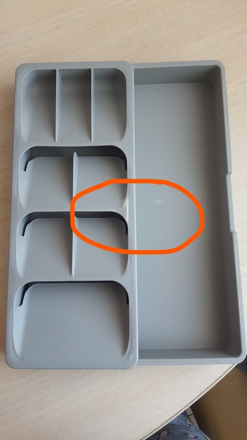 пластик хороший, не пахнет, гладкий, но все же не идеален - есть белесости. А так удобный, раздвижной, длина полная 40.5 высота 5.6 ширина от 16.5 (только под вилки-ложки) до 29.8., идеален для небольших кухонь.